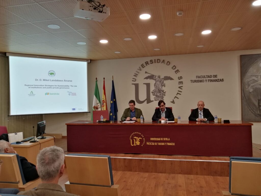 El día 13 de noviembre tuvo lugar la Conferencia del Dr. D. Mikel Landabaso Álvarez, Director de Economía Justa y Sostenible en el Centro Común de Investigación de la Comisión Europea, sobre el tema: “El papel de las instituciones y la gobernanza público-privada”. Dicha actividad se celebró en el Salón de Actos de la Facultad de Turismo y Finanzas de la Universidad de Sevilla.